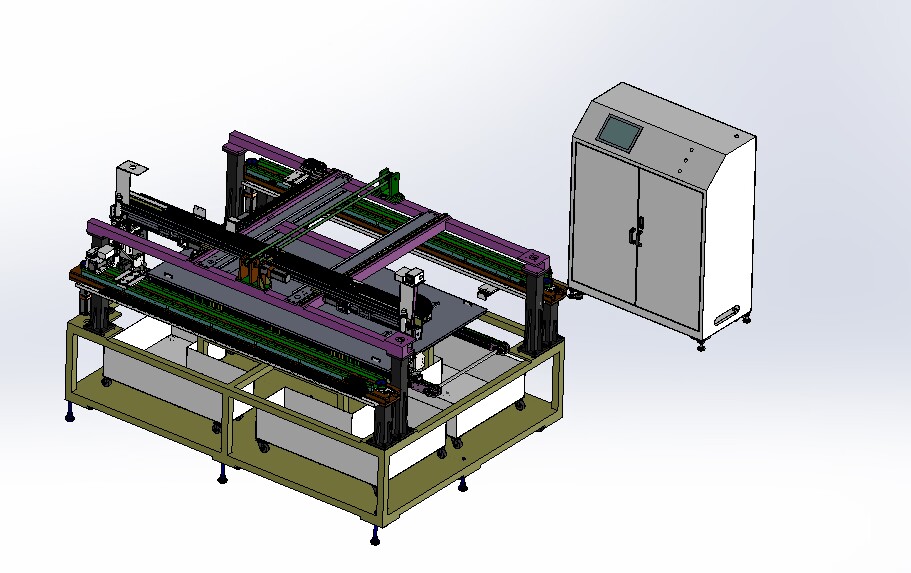 自動排版機的主要功能單元有:玻璃輸送定位系統(tǒng)、抓取行走系統(tǒng)、視覺檢測系統(tǒng)、電控系統(tǒng)等;通過以上功能單元,實現(xiàn)了將自動串焊機串焊好的電池串,按照工藝尺寸要求和排版方向順序自動排版鋪設到玻璃(EVA已經鋪設)上,組成電池串陣列。玻璃/EVA通過傳輸線傳輸至指定位置,機械手抓取電池串實現(xiàn)CCD定位、自動旋轉、自動排版功能。設備通過同步帶傳輸與自動生產線對接,實現(xiàn)了自動流水作業(yè)。